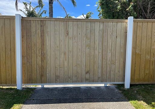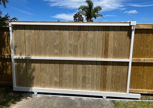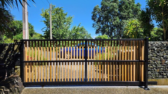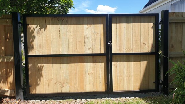 Our Aluminium Framed Driveway gates have the benefit of being strong and resilient to weather over time. The benefits are they will keep their shape over time. You can also match the timber panelling to your fence. They are a great addition, and if you have a high use gate, that you want to look good for a long time, we recommend going to an aluminium frame.